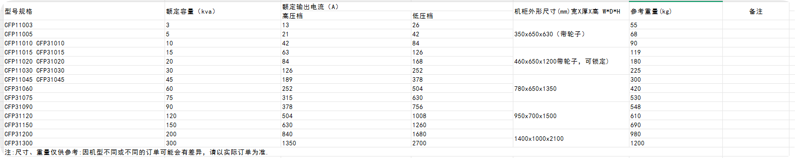 型号 额定容量 (KVA) 额定输出电源(A) 机柜外形尺寸 备注