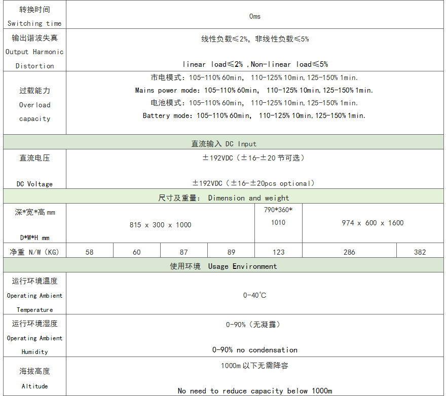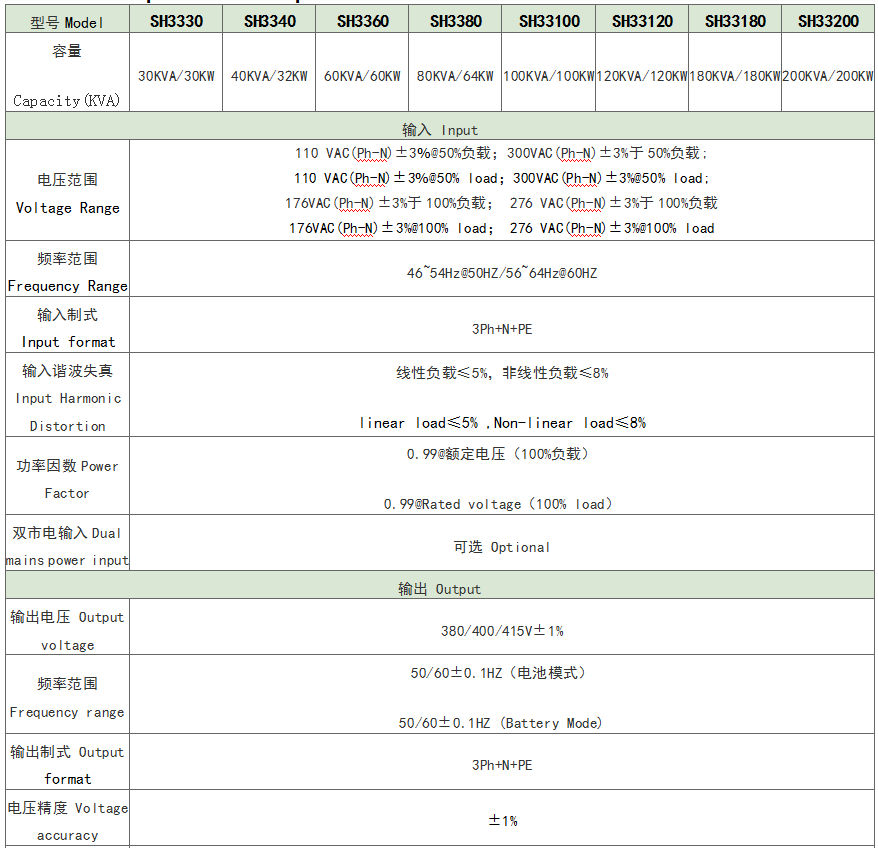 SH3系列高频在线式UPS主输入电源和旁路电源可分离,UPS有双路电源输入,从而可分别将两路不同的市电接入UPS提高输出电源供电的可靠性。双变换在线式拓扑结构设计,UPS的输出为频率跟踪、锁相、稳压和滤除噪声、不受电网波动干扰的纯净正弦波电源、使UPS对用户设备提供更为完美的保护。采用智能电池管理功能(ABM)技术,从而延长电池的使用寿命,减少电池维护次数。先进的恒流恒压自动转换充电技术,大限度活化电池,节省充电时间,延长电池的使用寿命。插入并机模块(选件)即可实现多达8台并机,增加系统的可靠性。系统伸缩性强,容易实现并机。非固定主从关系并机:在几台并联的UPS中,其中先开机的一台为主(Master)UPS,其他为从(Slave)UPS,主从UPS可以互换,如果一台UPS机器出现故障,该UPS自动切断输出,此时负载由剩下的UPS来提供电源.采用可拆解式模式设计,易维护并高度节约资源,采用智能风机转速调控设计,根据UPS各功率部件的负载情况,环境温度和实际温升情况,对风机进行智能开/关及转速调控,散热性能优越,高度节能;采用无环流控制电路,节电性能良好;采用绿色整流和逆变技术,为用户提供清洁的能源。